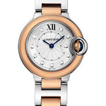 28mm stainless steel case, 9.35mm thick, 18K fluted pink gold crown set with cabochon-shaped spinel, sapphire crystal, silver dial with lacquered sunray effect, set with 11 brilliant-cut diamonds totalling 0.05 carats, quartz movement, 18K pink gold and stainless steel bracelet. Water resistant to 30 meters.