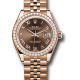 28mm 18K Everose gold oyster case, screw-down crown with twinlock double waterproofness system, bezel set with 44 diamonds, scratch-resistant sapphire crystal with cyclops lens over the date, chocolate dial, Roman numerals, Rolex calibre 2236 automatic movement with center hour, minute and seconds hands, instantaneous date with rapid setting, and stop-seconds for precise time setting, approximately 55 hours of power reserve, 18K Everose gold Jubilee bracelet with five-piece links, concealed folding Crownclasp buckle. Waterproof to 100 meters.
