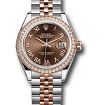 28mm Everose Rolesor case comprised of a 904L steel monobloc middle case, screw-down steel back, 18K Everose gold screw-down crown with twinlock double waterproofness system, 18K Everose gold diamond bezel, scratch-resistant sapphire crystal with cyclops lens over the date and double anti-reflective coating, chocolate dial, Roman numerals, Rolex calibre 2236 automatic movement with center hour, minute and seconds hands, instantaneous date with rapid setting, and stop-seconds for precise time setting, Everose Rolesor Jubilee bracelet comprised of a combination of 904L steel and 18K Everose gold in five-piece links, concealed folding Crownclasp buckle. Waterproof to 100 meters.