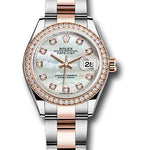 28mm Everose Rolesor case comprised of a 904L steel monobloc middle case, screw-down steel back, 18K Everose gold screw-down crown with twinlock double waterproofness system, 18K Everose gold diamond bezel, scratch-resistant sapphire crystal with cyclops lens over the date and double anti-reflective coating, white mother-of-pearl dial, diamond hour markers, Rolex calibre 2236 automatic movement with center hour, minute and seconds hands, instantaneous date with rapid setting, and stop-seconds for precise time setting, Everose Rolesor Oyster bracelet comprised of a combination of 904L steel and 18K Everose gold in flat three-piece links, folding Oysterclasp buckle with Easylink 5mm comfort extension link. Waterproof to 100 meters.