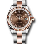 28mm Everose Rolesor case comprised of a 904L steel monobloc middle case, screw-down steel back, 18K Everose gold screw-down crown with twinlock double waterproofness system, 18K Everose gold fluted bezel, scratch-resistant sapphire crystal with cyclops lens over the date and double anti-reflective coating, chocolate dial, Roman numerals, Rolex calibre 2236 automatic movement with center hour, minute and seconds hands, instantaneous date with rapid setting, and stop-seconds for precise time setting, Everose Rolesor Oyster bracelet comprised of a combination of 904L steel and 18K Everose gold in flat three-piece links, folding Oysterclasp buckle with Easylink 5mm comfort extension link. Waterproof to 100 meters.