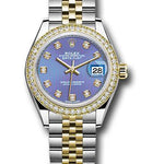 28mm yellow Rolesor case comprised of a 904L steel monobloc middle case, screw-down steel back, 18K yellow gold screw-down crown with twinlock double waterproofness system, 18K yellow gold diamond bezel, scratch-resistant sapphire crystal with cyclops lens over the date and double anti-reflective coating, lavender dial, diamond hour markers, Rolex calibre 2236 automatic movement with center hour, minute and seconds hands, instantaneous date with rapid setting, and stop-seconds for precise time setting, yellow gold Rolesor Jubilee bracelet comprised of a combination of 904L steel and 18K yellow gold in five-piece links, concealed folding Crownclasp buckle. Waterproof to 100 meters.