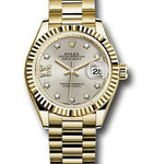 28mm 18K yellow gold oyster case, screw-down crown with twinlock double waterproofness system, fluted bezel, scratch-resistant sapphire crystal with cyclops lens over the date and double anti-reflective coating, silver dial, 9 diamonds set in star shaped hour marker settings and 8 diamond set in Roman numeral IX, Rolex calibre 2236 automatic movement with center hour, minute and seconds hands, instantaneous date with rapid setting, and stop-seconds for precise time setting, 18K yellow gold President bracelet with semi-circular three-piece links, concealed folding Crownclasp buckle. Waterproof to 100 meters.