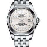 29.00 mm steel case, 8.90 mm thick, non screw-locked crown with two gaskets, tungsten carbide bezel, cambered sapphire crystal with glareproof treatment on both sides, mother-of-pearl dial, Breitling 72 thermocompensated SuperQuartz movement, steel bracelet. Water resistant to 100 m (330 ft).
