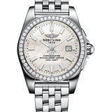 29.00 mm stainless steel case, non screw-locked crown with two gaskets, stainless steel bezel set with diamonds (~0.515 carats), cambered sapphire crystal with glareproof treatment on both sides, mother of pearl dial, SuperQuartz Breitling 72 movement with calendar aperture at 3 o'clock, stainless steel Pilot bracelet. Water resistant to 100 m (330 ft).