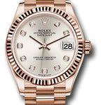 31mm 18K Everose gold case, screw-down crown with twinlock double waterproofness system, fluted bezel, scratch-resistant sapphire crystal with cyclops lens over the date, silver dial, diamond hour markers, Rolex calibre 2236 automatic movement with center hour, minute and seconds hands, instantaneous date with rapid setting, and stop-seconds for precise time setting, approximately 55 hours of power reserve, 18K Everose gold President bracelet with semi-circular three-piece links, concealed folding Crownclasp buckle. Waterproof to 100 meters.