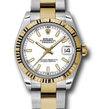 31mm stainless steel case, yellow gold screw-down crown, 18K yellow gold fluted bezel, scratch-resistant sapphire crystal with cyclops lens over the date, white dial, index hour markers, Rolex calibre 2235 automatic movement, stainless steel and yellow gold Oyster bracelet with flat three-piece links, folding Oysterclasp buckle with Easylink 5mm comfort extension link. Waterproof to 100 meters.