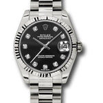 31mm 18K white gold case, screw-down crown with twinlock double waterproofness system, fluted bezel, scratch-resistant sapphire crystal with cyclops lens over the date, black dial, 10 diamond hour markers, Rolex calibre 2235 automatic movement, President bracelet with semi-circular three-piece links, concealed folding Crownclasp buckle. Waterproof to 100 meters.