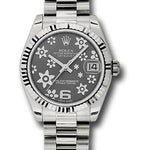 31mm 18K white gold case, screw-down crown with twinlock double waterproofness system, fluted bezel, scratch-resistant sapphire crystal with cyclops lens over the date, dark rhodium dial, floral motif, Rolex calibre 2235 automatic movement, President bracelet with semi-circular three-piece links, concealed folding Crownclasp buckle. Waterproof to 100 meters.