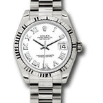 31mm 18K white gold case, screw-down crown with twinlock double waterproofness system, fluted bezel, scratch-resistant sapphire crystal with cyclops lens over the date, white dial, Roman numerals, Rolex calibre 2235 automatic movement, President bracelet with semi-circular three-piece links, concealed folding Crownclasp buckle. Waterproof to 100 meters.
