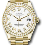 31mm 18K yellow gold case, screw-down crown with twinlock double waterproofness system, bezel set with 46 diamonds, scratch-resistant sapphire crystal with cyclops lens over the date, white dial, Roman numerals, Rolex calibre 2236 automatic movement with center hour, minute and seconds hands, instantaneous date with rapid setting, and stop-seconds for precise time setting, approximately 55 hours of power reserve, 18K yellow gold President bracelet with semi-circular three-piece links, concealed folding Crownclasp buckle. Waterproof to 100 meters.