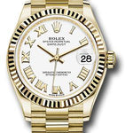 31mm 18K yellow gold case, screw-down crown with twinlock double waterproofness system, fluted bezel, scratch-resistant sapphire crystal with cyclops lens over the date, white dial, Roman numerals, Rolex calibre 2236 automatic movement with center hour, minute and seconds hands, instantaneous date with rapid setting, and stop-seconds for precise time setting, approximately 55 hours of power reserve, 18K yellow gold President bracelet with semi-circular three-piece links, concealed folding Crownclasp buckle. Waterproof to 100 meters.