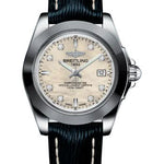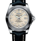 32.0 mm stainless steel and tungsten case, 10.7 mm thick, non screw-locked crown with three gaskets, diamond-set bezel, mother-of-pearl dial, Breitling 71 SuperQuartz™ movement, blue calfskin leather strap, tang buckle. Water resistant to 100 m (330 ft).