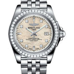 32.00 mm steel case, 10.79 mm thick, non screw-locked crown with three gaskets, diamond-set bezel, cambered sapphire crystal with glareproof treatment on both sides, mother-of-pearl diamond dial, Breitling 71 SuperQuartz movement, steel bracelet. Water resistant to 100 m (330 ft).