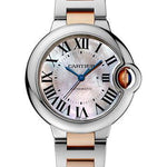 33mm 18K pink gold case, 9.96mm thick, sapphire back, fluted crown set with a synthetic cabochon-shaped spinel, sapphire crystal, pink mother-of-pearl dial with roman numerals, calibre 076 self-winding movement with sword-shaped hands, 18K pink gold and stainless steel bracelet. Water resistant to 3 bar.