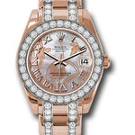 34mm 18K Everose gold case, screw-down crown, bezel set with 32 diamonds, scratch-resistant sapphire crystal with cyclops lens over the date, goldust dream dial, Roman numerals with 11 diamonds set on VI , Rolex calibre 2235 automatic movement, 18K Everose gold Pearlmaster bracelet with rounded five-piece links, two rows of links set with 186 diamonds, concealed folding Crownclasp buckle. Water resistant to 100 meters.