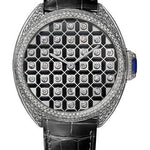 40 mm rhodiumized 18K white gold case set with 447 brilliant-cut diamonds, 12.29 mm thick, crown set with 28 brilliant-cut diamonds totaling 0.14 carats, 18K white gold dial with a black enamel motif, caliber 1847 MC automatic movement, shiny black alligator-skin strap, rhodiumized 18K white gold double adjustable folding buckle. Water resistant to 3 bar (approx 30 meters/100 feet).