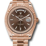 40mm 18K Everose gold case, screw-down back with Rolex fluting, screw-down crown with twinlock double waterproofness system, fluted bezel, scratch-resistant double anti-reflective sapphire crystal with cyclops lens over the date, chocolate diagonal motif dial, index hour markers with Chromalight, Rolex calibre 3255 automatic movement with centre hour, minute and seconds hands, instantaneous day and date in apertures, unrestricted rapid-setting, and stop-seconds for precise time setting, approximately 70 hours of power reserve, President bracelet with three-piece solid links comprised of a polished center link, satin-finished outer links, and ceramic inserts, concealed folding Crownclasp buckle. Waterproof to 100 meters.