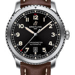 41.00 mm stainless steel case, 10.74 mm thick, screw-locked crown with two gaskets, bidirectional bezel, cambered sapphire crystal with glareproof treatment on both sides, black dial, Breitling 17 self-winding movement, approximately approx. 38 hrs of power reserve, brown calfskin leather strap, tang buckle. Water resistant to 100 m (330 ft).