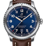 41.00 mm stainless steel case, 10.74 mm thick, screw-locked crown with two gaskets, bidirectional bezel, cambered sapphire crystal with glareproof treatment on both sides, blue dial, Breitling 17 self-winding movement, approximately approx. 38 hrs of power reserve, brown calfskin leather strap, tang buckle. Water resistant to 100 m (330 ft).