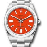 41mm Oystersteel case, screw-down crown with twinlock double waterproofness system, domed bezel, scratch-resistant sapphire crystal, coral red dial, index hour markers, Rolex calibre 3230 automatic movement with center hour, minute and seconds hands, and stop-seconds for precise time setting, approximately 70 hours of power reserve, Oyster bracelet with flat three-piece links, folding Oysterclasp buckle with Easylink 5mm comfort extension link. Waterproof to 100 meters.