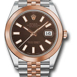 41mm Everose Rolesor case with 904L steel monobloc middle case, screw-down steel back, 18K Everose gold screw-down crown, 18K Everose gold smooth bezel, scratch-resistant double anti-reflective sapphire crystal with cyclops lens over the date, chocolate dial, index hour markers, Rolex calibre 3235 perpetual self-winding movement with date at 3 o'clock that changes instantaneously at midnight in a few thousandths of a second, approximately 70 hours of power reserve, Everose Rolesor Jubilee bracelet made from a combination of 904L steel and 18K Everose gold with five-piece links, folding Oysterclasp buckle with Easylink 5mm comfort extension link. Waterproof to 100 meters.