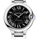42 mm stainless steel case, 13 mm thick, fluted crown decorated with a synthetic cabochon-shaped spinel, sapphire crystal, black dial with Roman numeral and sword-shaped hands in blue steel, self-winding movement, stainless steel bracelet. Water resistant to 30 meters.