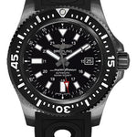 44.00 mm black steel case, screw-locked crown, unidirectional ratcheted black ceramic bezel, cambered sapphire crystal with glareproof treatment on both sides, selfwinding mechanical Breitling 17 movement with date display, 40 hours of power reserve, black Ocean Racer II strap with tang-type buckle. Water resistant to 1,000 m (3,300 ft).