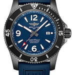 46.00 mm black steel case, 16.85 mm thick, screw-locked crown with two gaskets, unidirectional ratcheted bezel, cambered sapphire crystal with glareproof treatment on both sides, blue dial, Breitling 17 self-winding movement, approximately 38 hrs of power reserve, blue rubber strap, tang buckle. Water resistant to 2,000 m (6,600 ft).