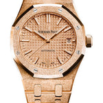 37 mm hammered 18K pink gold case, 9.8 mm thick, sapphire crystal back, screw-locked crown, pink gold-toned dial with Grande Tapisserie pattern, pink gold applied hour-markers and Royal Oak hands with luminescent coating, Manufacture Calibre 3120 selfwinding movement with hours, minutes, centre seconds and date, approximately 60 hours of power reserve, hammered 18K pink gold bracelet, AP folding buckle. Water resistant to 50 m.
