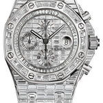 42 mm 18K white gold case entirely set with baguette-cut diamonds, 15.4 mm thick, glareproofed sapphire crystal back, screw-locked crown set with baguette-cut diamonds, glareproofed sapphire crystal, 18K white gold dial paved with baguette-cut diamonds, blackened gold Royal Oak hands with luminescent coating, white gold inner bezel set with baguette-cut diamonds, Calibre 3126 / 3840 Manufacture selfwinding movement with chronograph, hours, minutes, small seconds, date, approximately 50 hours of power reserve, 18K white gold bracelet entirely set with baguette-cut diamonds, AP folding buckle.
