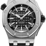42.00mm stainless steel case, 14.10mm thick, glareproof sapphire back, black rubber clad screw-locked crown, stainless steel bezel, glareproofed sapphire crystal, black dial with Mega Tapisserie pattern, white gold applied hour-markers and Royal Oak hands with luminescent coating, black rotating inner bezel with diving scale and zone from 60 to 15 minutes in black, Caliber 3120 self-winding movement with hours, minutes, center seconds, date, approximately 60 hours of power reserve, black rubber strap, stainless steel pin buckle. Water resistant to 300 meters.