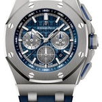 42 mm titanium case, 12.8 mm thick, screw-locked crown, titanium bezel, blue dial with Mega Tapisserie pattern, grey counters, white gold applied hour-markers and Royal Oak hands with luminescent coating, blue inner bezel, Calibre 2385 selfwinding movement with chronograph, hours, minutes, small seconds and date, approximately 40 hours of power reserve, blue rubber strap with additional white rubber strap, titanium pin buckle. Water resistant to 100 m.