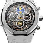 44mm titanium case, 14.80mm thick, sapphire back, screw-locked crown, titanium bezel, sapphire crystal, dial with smoky counters, white gold royal oak hands with luminescent coating, white counter/seconds/split-seconds chronograph hands, black inner bezel with white minute-circle, slate grey movement, caliber 2885 self-winding movement with perpetual calendar indicating the day, the date, the week, the moon phases, the month and the leap years, minute repeater, split-seconds chronograph and small seconds at 9 o'clock, approximately 45 hours of power reserve, titanium bracelet, AP folding buckle. Water resistant to 20 meters.