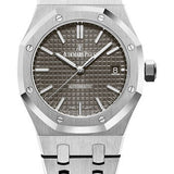 37 mm stainless steel case, 9.8 mm thick, glareproofed sapphire crystal back, glareproofed sapphire crystal, ruthenium-toned dial with Grande Tapisserie” pattern, white gold applied hour-markers and Royal Oak hands with luminescent coating, Calibre 3120 selfwinding movement with dive-time measurement, hours, minutes, center seconds and date, approximately 60 hours of power reserve, stainless steel bracelet, AP folding buckle. Water resistant to 50 meters.