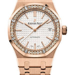 37 mm 18K pink gold case, 9.8 mm thick, glareproofed sapphire crystal back, screw-locked crown, diamond-set bezel, glareproofed sapphire crystal, silver-toned dial with Grande Tapisserie pattern, pink gold applied hour-markers and Royal Oak hands with luminescent coating, Calibre 3120 selfwinding movement with dive-time measurement, hours, minutes, center seconds and date, approximately 60 hours of power reserve, 18K pink gold bracelet, AP folding buckle. Water resistant to 50 meters.
