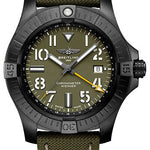 45.0 mm DLC-coated titanium case, 12.3 mm thick, screw-locked crown with two gaskets, unidirectional ratcheted bezel, green dial, Breitling 32 self-winding movement, approximately approx. 42 hours of power reserve, khaki green calfskin leather strap, pushbutton folding buckle. Water resistant to 300 m (1,000 ft).