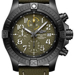45.00 mm DLC-coated titanium case, 16.46 mm thick, cambered sapphire crystal with glareproof treatment on both sides, green dial, Breitling 13 self-winding movement, approximately approx. 48 hrs of power reserve, khaki green calfskin leather strap, pushbutton folding buckle. Water resistant to 300 m (1,000 ft).