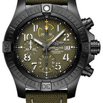 45.00 mm DLC-coated titanium case, 16.46 mm thick, cambered sapphire crystal with glareproof treatment on both sides, green dial, Breitling 13 self-winding movement, approximately approx. 48 hrs of power reserve, khaki green calfskin leather strap, tang buckle. Water resistant to 300 m (1,000 ft).