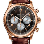 43.00 mm red gold case, 13.97 mm thick, sapphire crystal back, screw-locked crown with two gaskets, bidirectional bezel, cambered sapphire crystal with glareproof treatment on both sides, bronze dial, Breitling 01 self-winding movement with date in dial aperture and chronograph function, approximately 70 hours of power reserve, brown croco strap, tang buckle. Water resistant to 100 m (330 ft).
