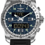 46.00 mm titanium case, back with screws, non screw-locked crown with two gaskets and integrated push piece, bidirectional ratcheted rotating bezel windrose, cambered sapphire crystal with glareproof treatment on both sides, Air Force blue dial, thermocompensated SuperQuartz electronic Breitling B50 movement with rechargeable battery, chronograph function, countcown countup clock, flight time chronograph, electronic tachometer, countdown, 2nd timezone, alarms, analog and 12/24 hr LCD digital display, backlighting, and EOL indicator, black Diver Pro III strap with deployant buckle. Water resistant to 100 m (330 ft).