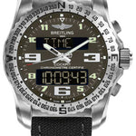 46.00 mm titanium case, back with screws, non screw-locked crown with two gaskets and integrated push piece, bidirectional ratcheted rotating bezel windrose, cambered sapphire crystal with glareproof treatment on both sides, Titanium gray dial, thermocompensated SuperQuartz electronic Breitling B50 movement with rechargeable battery, chronograph function, countcown countup clock, flight time chronograph, electronic tachometer, countdown, 2nd timezone, alarms, analog and 12/24 hr LCD digital display, backlighting, and EOL indicator, anthracite military strap with tang-type buckle. Water resistant to 100 m (330 ft).