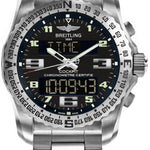 46.00 mm titanium case, back with screws, non screw-locked crown with two gaskets and integrated push piece, bidirectional ratcheted rotating bezel windrose, cambered sapphire crystal with glareproof treatment on both sides, Volcano black dial, thermocompensated SuperQuartz electronic Breitling B50 movement with rechargeable battery, chronograph function, countcown countup clock, flight time chronograph, electronic tachometer, countdown, 2nd timezone, alarms, analog and 12/24 hr LCD digital display, backlighting, and EOL indicator, titanium Professional III bracelet. Water resistant to 100 m (330 ft).