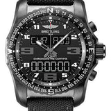 46.00 mm black titanium case, 16.45 mm thick, non screw-locked crown with two gaskets and integrated pushpiece, bidirectional compass scale bezel, cambered sapphire crystal with glareproof treatment on both sides, volcano black dial, Breitling B50 (Manufacture) SuperQuartz movement, black military strap, tang buckle. Water resistant to 100 m (330 ft).