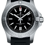 44.0 mm stainless steel case, 11.2 mm thick, screw-locked crown with two gaskets, unidirectional ratcheted bezel, black dial, Breitling 17 self-winding movement, approximately 38 hrs of power reserve, black rubber strap, pushbutton folding buckle. Water resistant to 200 m (660 ft).
