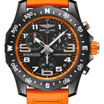 44.0 mm Breitlight® case, 12.5 mm thick, non screw-locked crown with two gaskets, bidirectional compass scale bezel, black dial, Breitling 82 thermocompensated SuperQuartz™ movement, orange rubber strap, tang buckle. Water resistant to 100 m (330 ft).