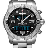 46.00 mm titanium case, 15.25 mm thick, non screw-locked crown with two gaskets and integrated pushpiece, 38 jewels bezel, sapphire crystal with glareproof treatment on both sides, black dial, Breitling B55 (Manufacture) SuperQuartz™ movement, metal bracelet. Water resistant to 100 m (330 ft).