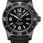 46.00 mm black steel case, 16.85 mm thick, screw-locked crown with two gaskets, unidirectional ratcheted bezel, cambered sapphire crystal with glareproof treatment on both sides, black dial, Breitling 17 self-winding movement, approximately 38 hrs of power reserve, numerals,black rubber strap, tang buckle. Water resistant to 2,000 m (6,600 ft).
