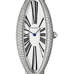 52 mm x 23 mm rhodiumized white gold case set with brilliant-cut diamonds, rhodiumized 18K white gold beaded crown set with a brilliant-cut diamond, sapphire crystal, silver dial, caliber 1917 MC manual movement, light gray strap, rhodiumized 18K white gold ardillon buckle. Water resistant to 3 bar (approx. 30 meters/100 feet).