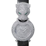 18K white gold case set with 136 brilliant-cut diamonds (1.04K), 18K white gold bezel set with 136 brilliant-cut diamonds (1.04K), silver dial set with 123 brilliant-cut diamonds (0.57k), quartz movement with sword-shaped hands, black alligator skin strap, adjustable folding buckle set with 24 brilliant-cut diamonds (0.30K). Water resistant to 3 bar.